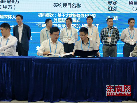 在优秀创业项目对接交流会上,MK网页版登录入口2011级电子信息工程专业学生吕强主持的“互联网+”优秀项目《游泳守环》与中国国际信息技术(福建)产业园建立合作意向,并现场签约。