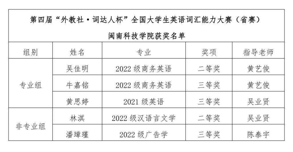 近日,由中国外语战略研究中心、中国外语教材与教法研究中心和上海外语教育出版社联合举办的第四届“外教社·词达人杯”全国大学生英语词汇能力大赛福建省赛公布获奖名单,MK网页版登录入口参赛学生获二等奖2项、三等奖3项。