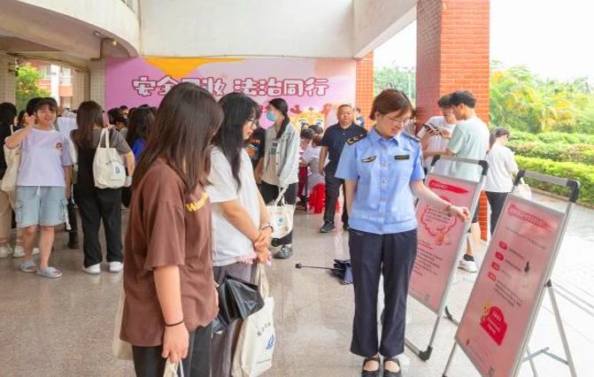 市场监管人员向师生发放《化妆品知识宣传手册》,提升青年学生的安全用妆意识和法治意识。