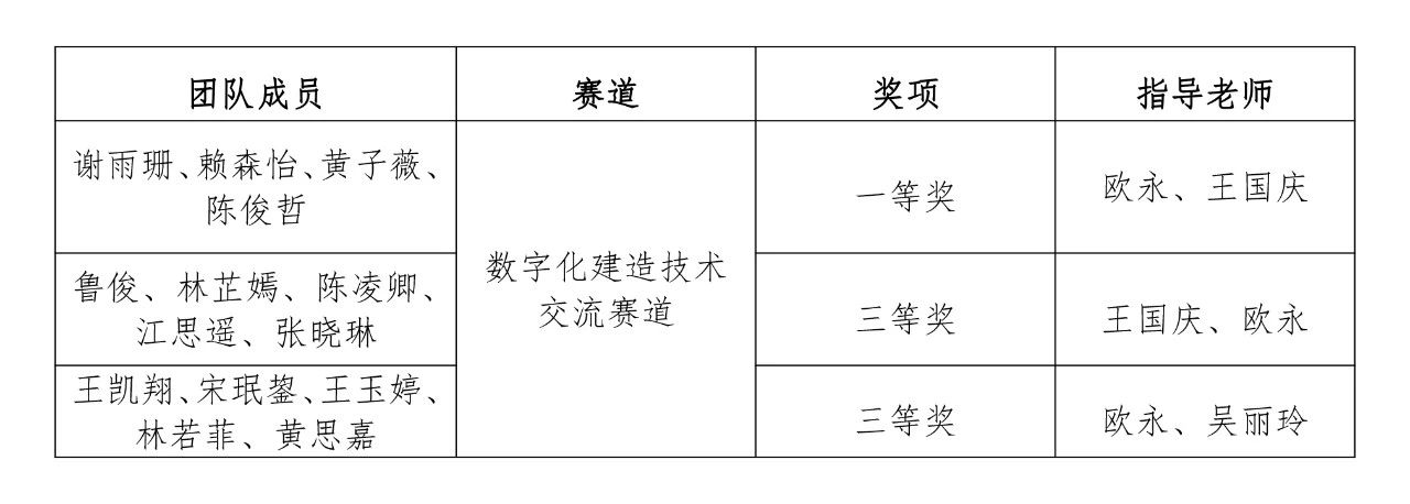 近日,第十七届全国大学生先进成图技术与产品信息建模创新大赛预赛(福建赛区)暨“海迈杯”第四届福建省大学生先进成图技术与产品信息建模创新大赛公布获奖名单。MK网页版登录入口土木工程学院选派的三支参赛团队从福建省31所本科及高职院校的338名学生中脱颖而出,荣获大赛建筑类数字化建造技术交流赛道一等奖1项、三等奖2项的好成绩。