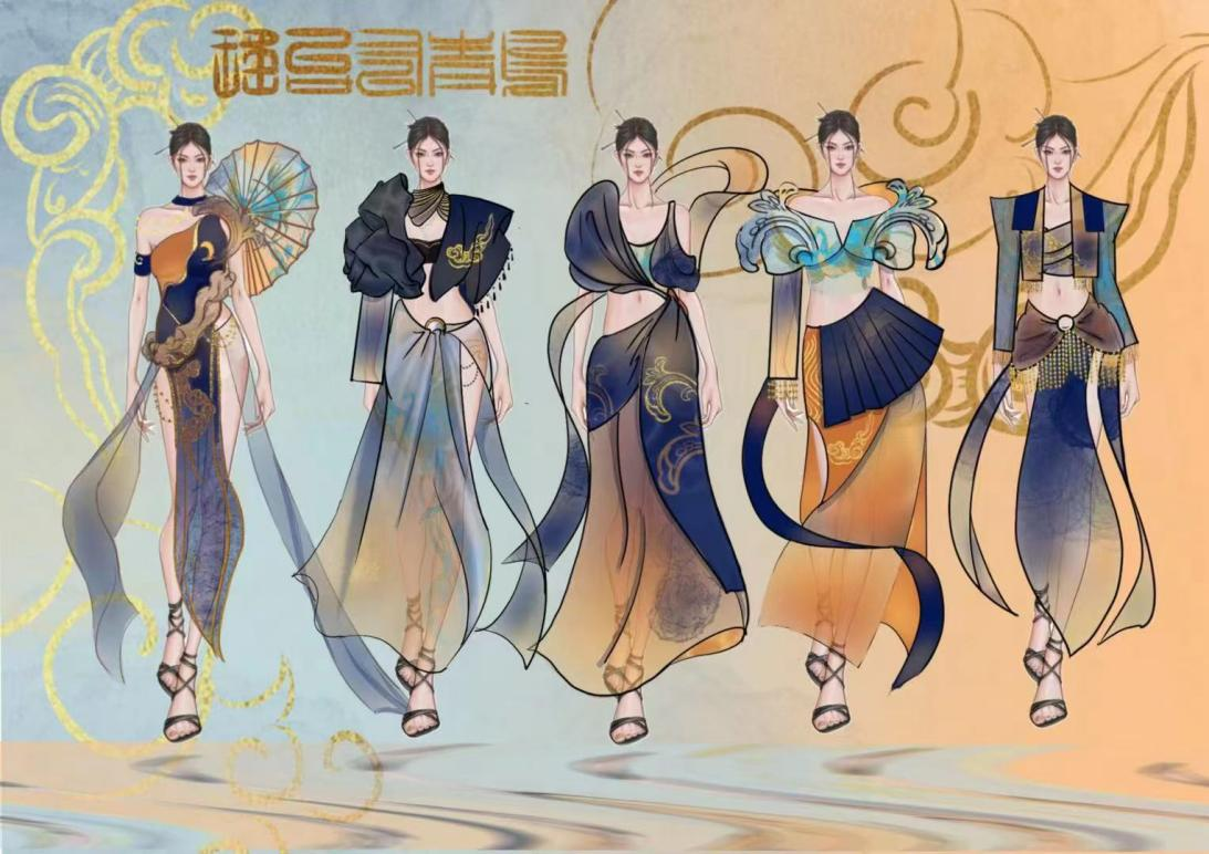 作品简介:根据敦煌故事中四大瑞兽之一——青鸟产生创作灵感,参考敦煌壁画青鸟的形象进行创作图案与提取色彩。造型诠释, 参考敦煌壁画中青乌形象的尾羽创作图案纹样,并根据《飞天》衍生出服装造型与下摆飘逸灵动的丝绸与缎带装饰,搭配烫金纹案与青鸟尾羽纹样打造神秘灵动的特殊的感觉,青鸟栖于瑶台,上而翱翔九天。