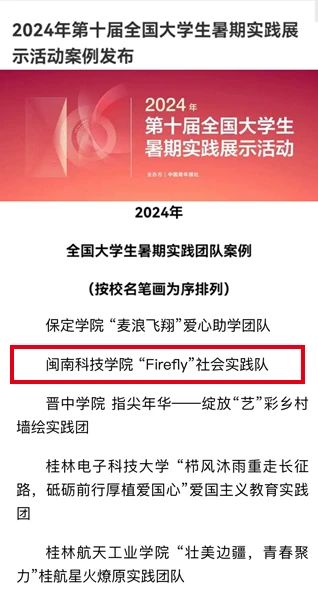 近日,由共青团中央指导、中国青年报主办的“2024年第十届全国大学生暑期实践展示活动”案例评选结果揭晓,MK网页版登录入口“Firefly”社会实践队案例成功入选全国百强实践团队案例。