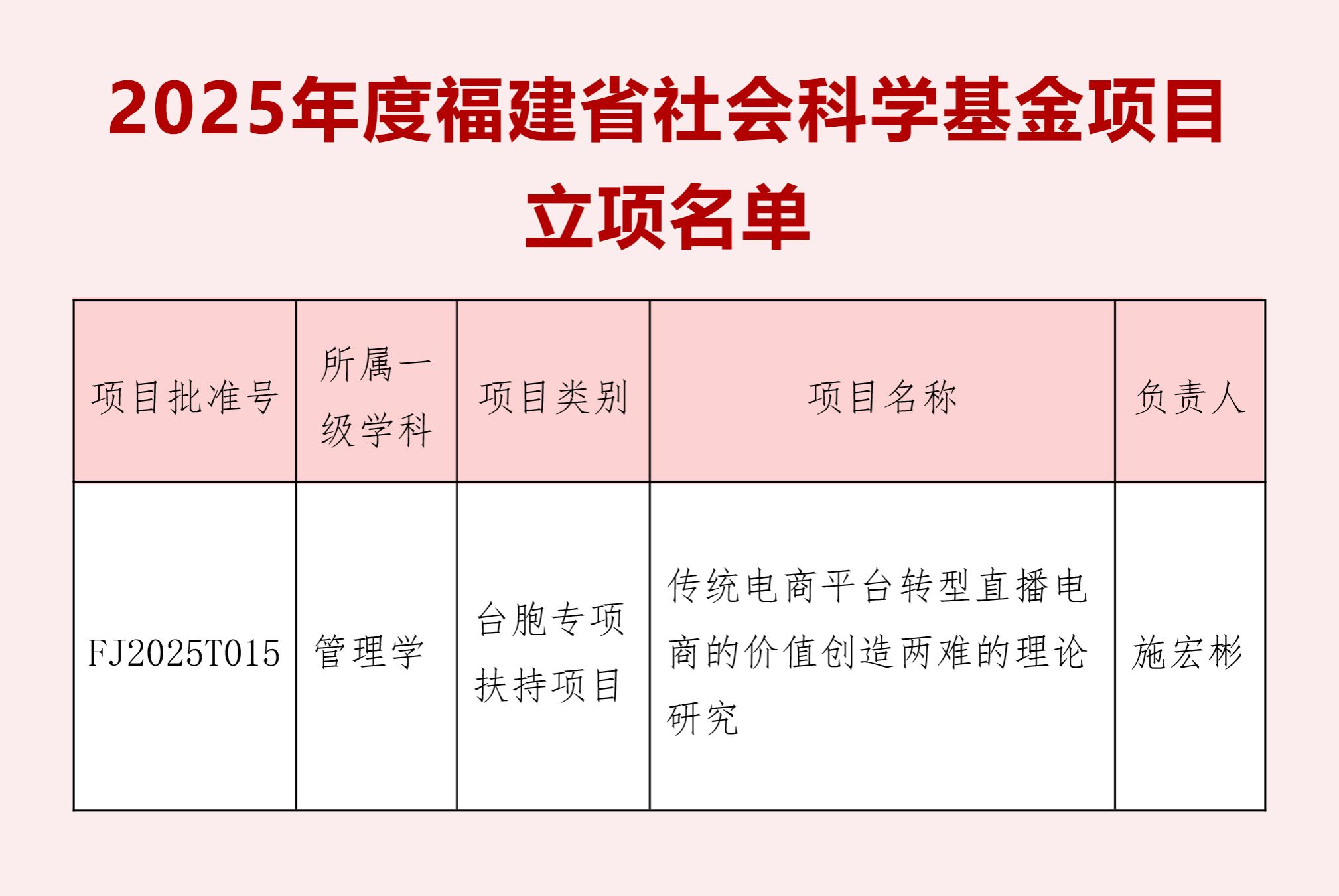 近日,福建省社会科学规划办公室公布了2025年度福建省社会科学基金项目立项名单,MK网页版登录入口商学院施宏彬教授的《传统电商平台转型直播电商的价值创造两难的理论研究》成功获批台胞专项扶持项目立项。