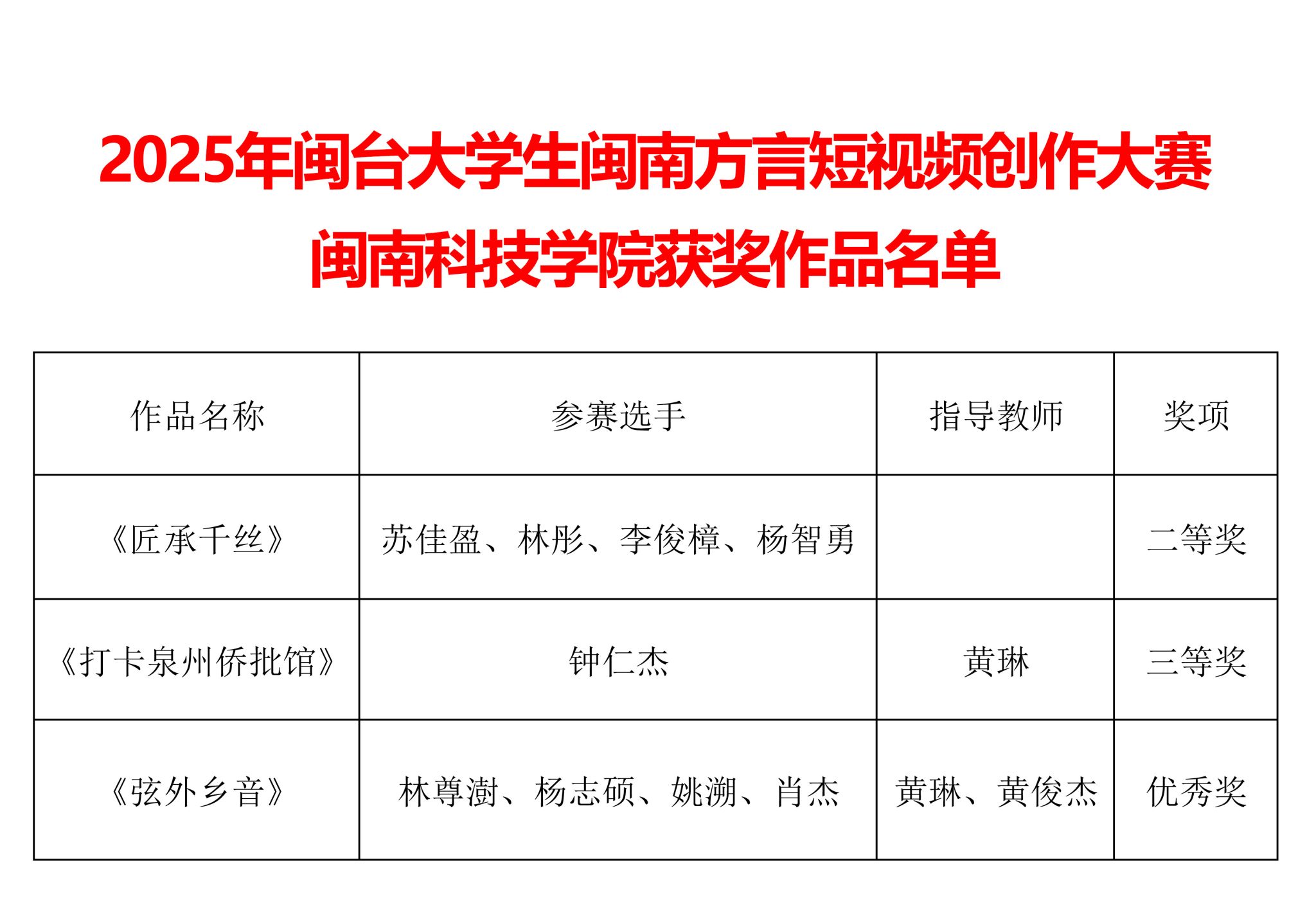 近日,2025年闽台大学生闽南方言短视频创作大赛公布获奖名单,MK网页版登录入口艺术设计学院学子获得二等奖1项、三等奖1项、优秀奖1项。