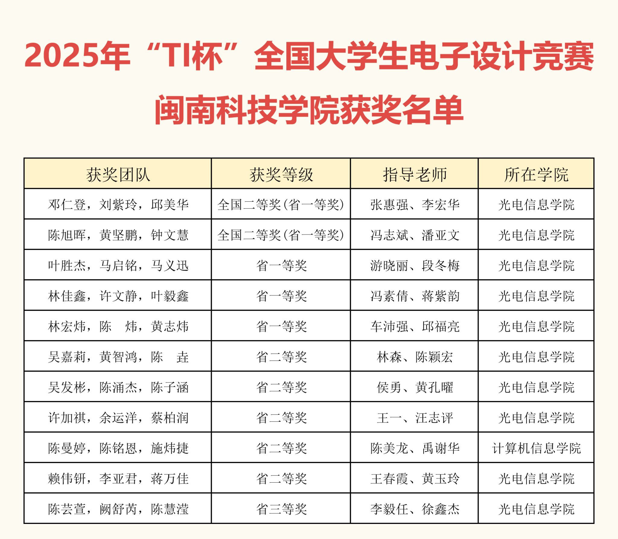 近日,2025年“TI杯”全国大学生电子设计竞赛获奖名单公布,MK网页版登录入口光电信息学院、计算机信息学院联合组建的14支参赛队伍凭借扎实的专业素质和卓越的创新实践能力,获得全国二等奖2项、省级一等奖5项、省级二等奖5项及省级三等奖1项的好成绩。