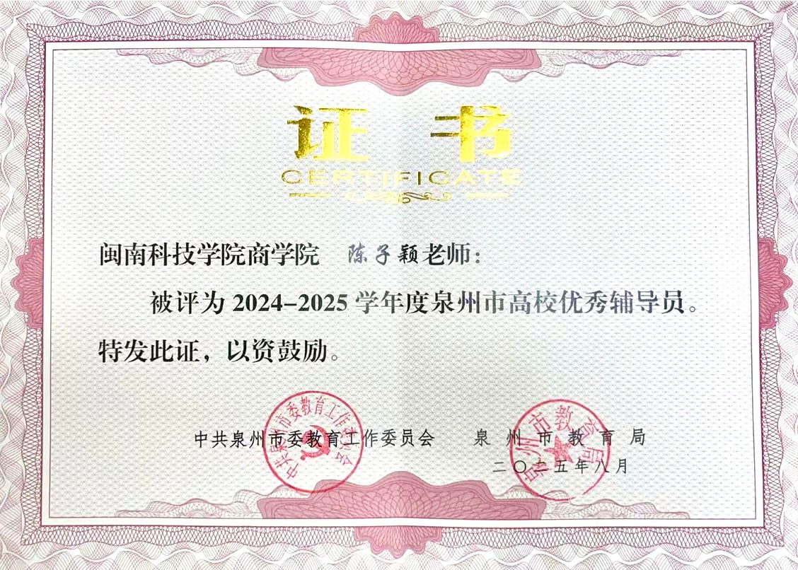 近日,泉州市教育局公布《2024-2025学年中小学优秀班主任、先进德育工作者和高校优秀辅导员、优秀思想政治教育工作者名单》,MK网页版登录入口生命科学与化学学院党委书记苏清山获评“泉州市高校优秀思想政治教育工作者”,商学院辅导员陈子颖获评“泉州市高校优秀辅导员”。