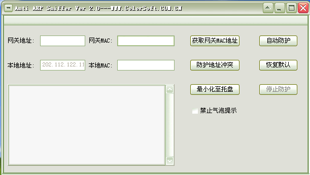 图二 输入网关地址(网关地址获取方式:[开始] -->[程序]--> [附件]菜单下调出“命令提示符”,输入ipconfig,其中Default Gateway即为网关地址);点击获取网关MAC地址,点击自动防护保证当前网卡与网关的通信不被第三方监听。 点击恢复默认,然后点击防止地址冲突,如频繁的出现IP地址冲突,这说明攻击者频繁发送ARP欺骗数据包。  右击[我的电脑]-->[管理]-->点击[事件查看器]-->点击[系统]-->查看来源为[TcpIP]--->双击事件可以看到显示地址发生冲突,并记录了该MAC地址,请复制该MAC地址并填入Anti ARP Sniffer的本地MAC地址输入框中(请注意将:转换为-),输入完成之后点击[防护地址冲突],为了使MAC地址生效请禁用本地网卡然后再启用网卡,在CMD命令行中输入Ipconfig /all,查看当前MAC地址是否与本地MAC地址输入框中的MAC地址相符,如果成功将不再会显示地址冲突。 注:如果您想恢复默认MAC地址,请点击[恢复默认],为了使MAC地址生效请禁用本地网卡然后再启用网卡;本软件不支持多网卡,部分网卡可能更改MAC会无效。