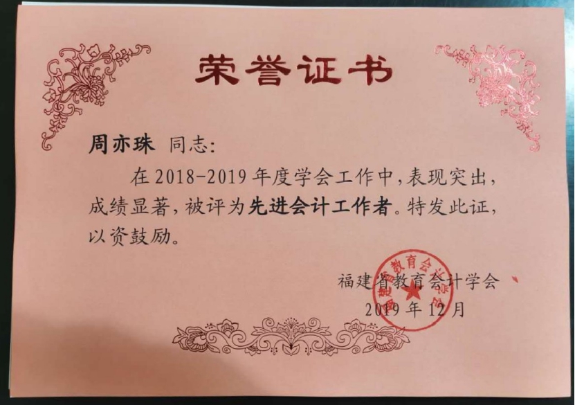 近日,福建省教育会计学会对全省高校财务工作先进单位与个人进行表彰,MK网页版登录入口财务处获评“2018-2019年度学会工作先进财会单位”。财务处处长周亦珠被授予“先进会计工作者”荣誉称号。