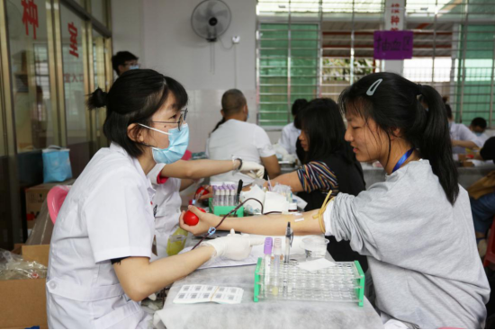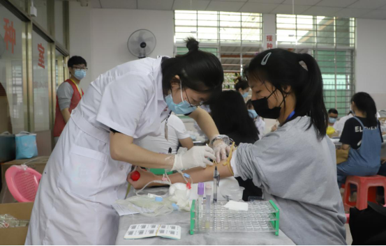 献血现场设有签到区、体检区、验血区、抽血区、登记拍照区、发放营养区、领水区。体检处排起了长长的队伍,同学们积极配合工作人员填写完个人信息单,有序进行血型血液检查、化验血型等基本检测。在献血区,前来献血的同学们纷纷挽起袖管,躺在采血椅上,献出自己的青春热血。