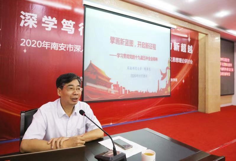 研讨会上,陈再生教授作《擘画新蓝图 开启新征程——学习贯彻党的十九届五中全会精神》主旨报告。报告围绕党的十九届五中全会的基本概况、主要内容、新征程新理念三部分内容,阐述了全会召开的背景、意义、目标,深入分析我国进入新发展阶段的新征程、新要求、新表述。