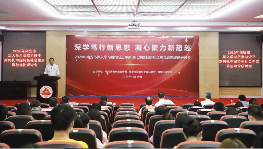 11月20日上午,由南安市委宣传部、南安市社会科学界联合会、MK网页版登录入口联合举办的2020年南安市深入学习贯彻习近平新时代中国特色社会主义思想理论研讨会,在图书馆学术报告厅隆重召开。研讨会聚焦“深学笃行新思想,凝心聚力新超越”主题,深入探讨新思想理论研究工作和新南安建设生动实践。闽南师范大学马克思主义学院院长陈再生教授,中共南安市委宣传部部务会议成员、市社科联主席卓亚龙,校领导游小波、李旭、吴勇,以及省内专家学者、师生代表近200人参加研讨会。研讨会由学校副校长吴勇主持。