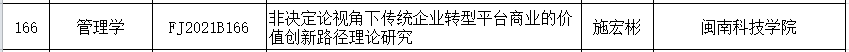 近日,2021年度福建省社会科学规划项目立项结果公布,MK网页版登录入口商学院教授施宏彬博士主持申报的《非决定论视角下传统企业转型平台商业的价值创新路径理论研究》获一般项目立项。