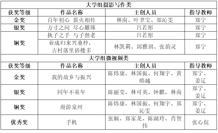 据悉,本届比赛在全省各地各校推荐基础上,经资格审查、专家评审、作品核实,综合评定大中小学摄影写作类、微视频类共530件作品获得第五届福建省校园微拍大赛金奖、银奖、铜奖和优秀奖,其中获得金奖作品指导教师获得优秀指导教师荣誉称号。