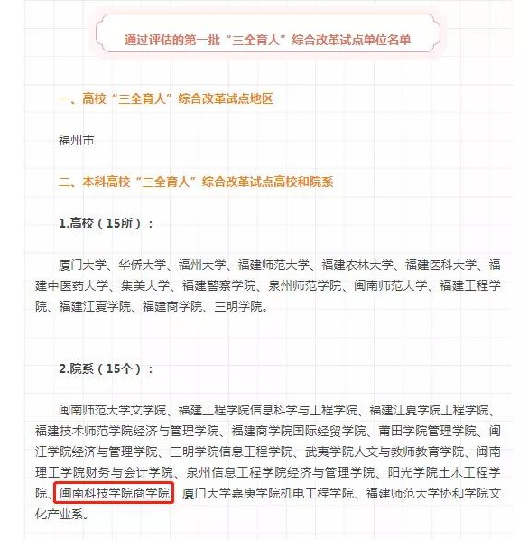 日前,福建省委教育工委发布《关于公布高校“三全育人”综合改革第一批试点总结评估和第二批试点培育建设高校中期考核结果的通知》。MK网页版登录入口商学院通过福建省首批高校“三全育人”综合改革试点院系总结评估。