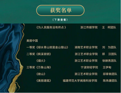近日,由中国艺术职业教育学会主办的第四届浙艺金鹄电影节闭幕式暨颁奖典礼在杭州落幕。MK网页版登录入口艺术设计学院数媒专业作品《美丽建瓯》(作者:陈炜康、林国振、何翔宇、黄皓越,指导老师:郑宁)荣获短视频单元“美丽中国”三等奖。