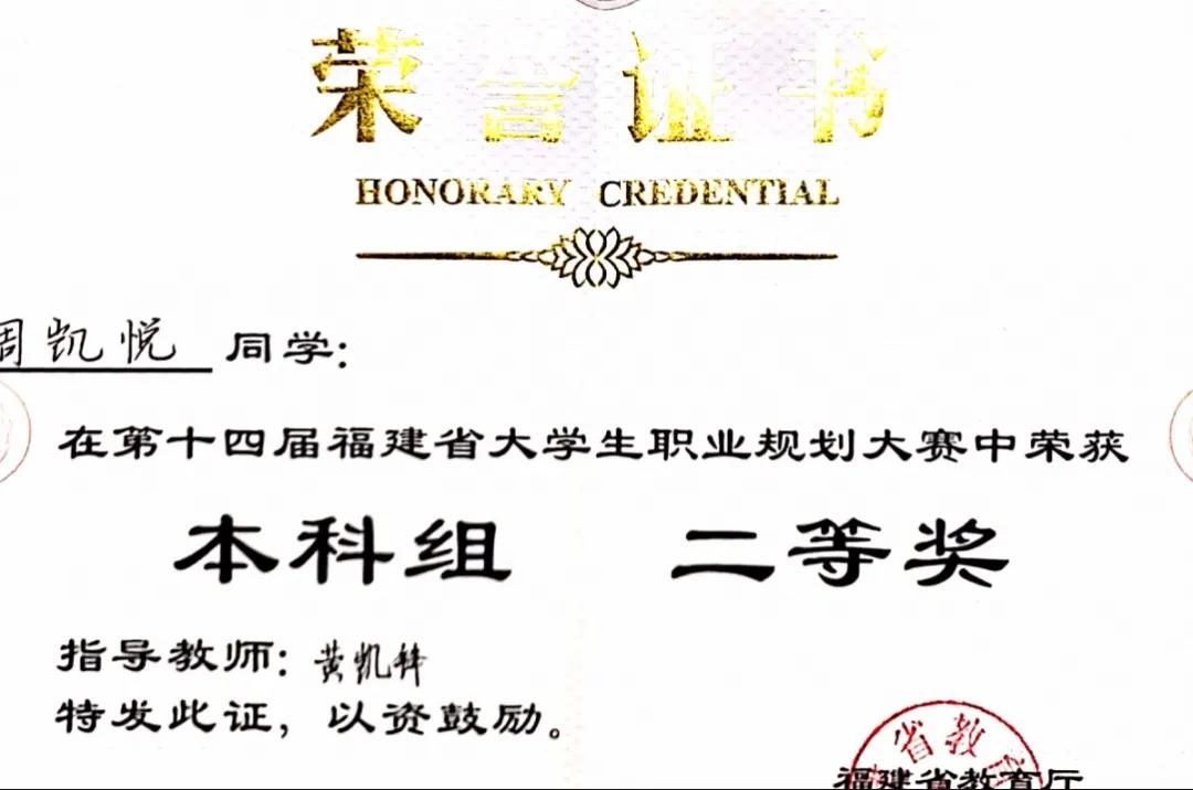 11月19日,由福建省教育厅主办的第十四届福建省大学生职业规划大赛总决赛和颁奖典礼在福建技术师范学院举行。MK网页版登录入口2021级市场营销专业(专升本)周凯悦同学获得大赛本科组二等奖。