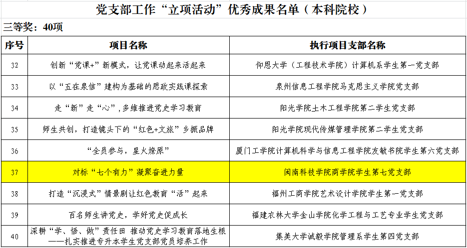 近日,中共福建省委教育工作委员会公布高校党支部工作“立项活动”优秀成果和“党员好故事、书记好党课、支部好案例”获奖名单,MK网页版登录入口商学院学生第七党支部《对标“七个有力”凝聚奋进力量》荣获福建省本科院校党支部工作“立项活动”优秀成果三等奖。