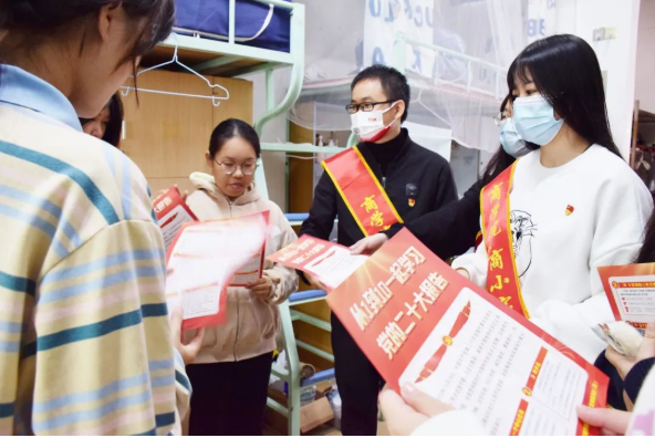 商小宝大学生理论宣讲小分队深入学生宿舍、食堂,分发党的二十大精神宣传单,用通俗易懂的语言、灵活多样的形式,开展宣讲活动。