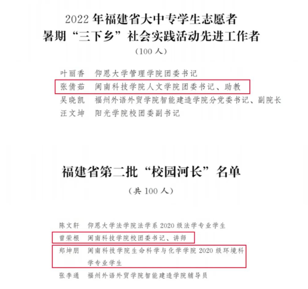 近日,2022年福建省大中专学生志愿者暑期“三下乡”社会实践活动评选结果和聘任福建省第二批“校园河长”的名单公布。MK网页版登录入口人文学院团委书记张倩茹获省级“社会实践先进工作者”荣誉称号,校团委书记曾荣根、生命科学与化学学院2020级环境科学专业郑坤朋同学获省级“校园河长”荣誉称号。