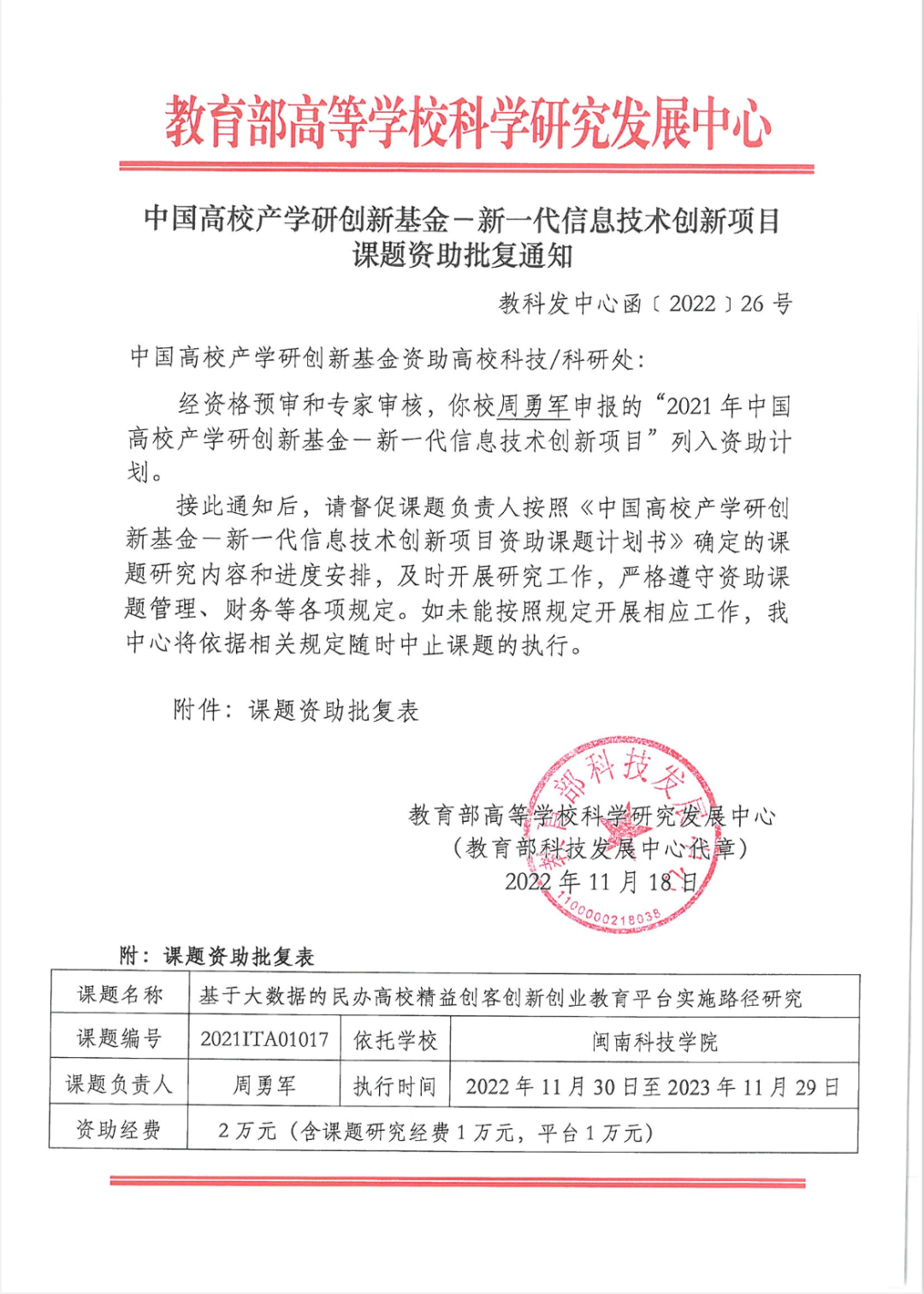 近日,MK网页版登录入口周勇军副研究员申报的《基于大数据的民办高校精益创客创新创业教育平台实施路径研究》获得“中国高校产学研创新基金”立项。