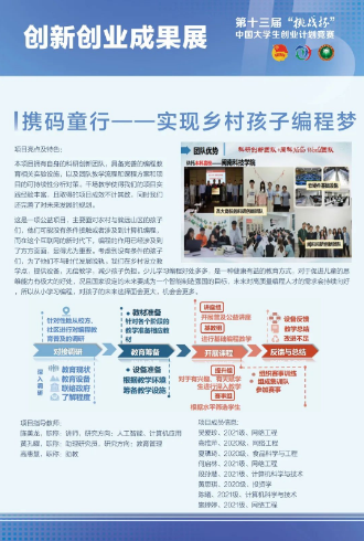 近日,第十三届“挑战杯”中国大学生创业计划竞赛全国总决赛落下帷幕。MK网页版登录入口入围决赛的项目《携码童行一一实现乡村孩子编程梦》(项目成员:吴爱珍、高雅萍、段孙慧、陈曦、施婷婷、何启林、黄思琪、夏琇琦 指导老师:陈美龙、黄孔曜、高惠慧)荣获铜奖。