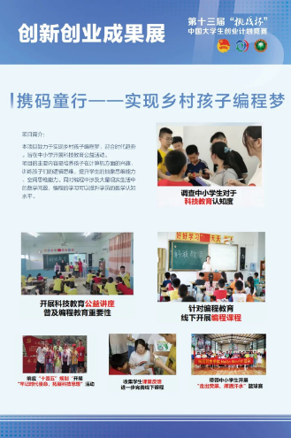 项目《携码同行一一实现乡村孩子编程梦》围绕乡村教育发展不均衡的问题,组织项目成员深入乡村开展科技教育公益活动,帮助培养孩子在计算机方面的兴趣训练、逻辑思维,提升孩子的抽象思维能力和空间思维能力。同时,在编程教学中还涉及大量现实生活中的数学问题,有助于提升孩子的数学认知水平,进一步实现乡村孩子的编程梦。