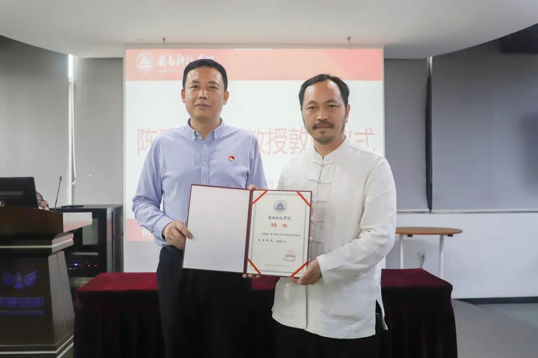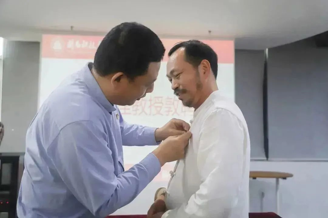 敦聘仪式上,校党委书记李旭为陈明良教授颁发聘书、佩戴校徽。