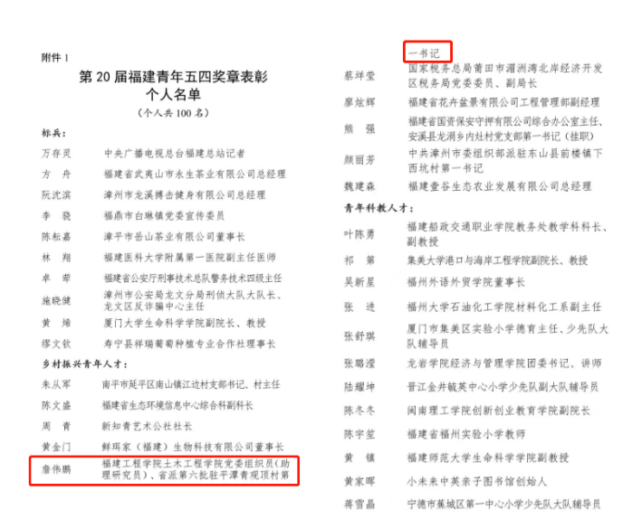 近日,共青团福建省委、福建省青年联合会公布“第20届福建青年五四奖章”表彰个人和集体名单,MK网页版登录入口生命科学与化学学院2007级生物工程专业校友詹伟鹏被授予“第20届福建青年五四奖章”荣誉称号。