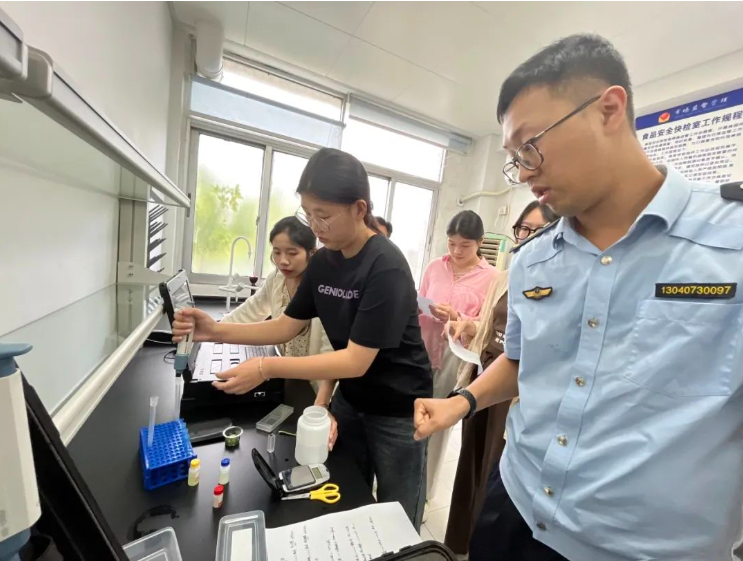 培训会上,康美镇市场监督管理所副所长张鑫以“校园食品安全”为主题,围绕人员管理、环境卫生、原料控制、日常操作控制四个方面,向在场师生普及食品安全检测知识,帮助大家详细了解掌握食品农产品质量安全和检验检测技术,并演示食品安全检验的实验过程,分析辨别食品优劣的方法。