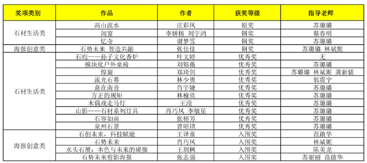 近日,水头世界石都首届艺术设计大奖赛获奖结果公布,MK网页版登录入口学子经过激烈的角逐,分别荣获石材生活类银奖1项,石材生活类铜奖2项,海报创意类铜奖1项,石材生活类优秀奖10项,海报创意类入围奖4项的好成绩。