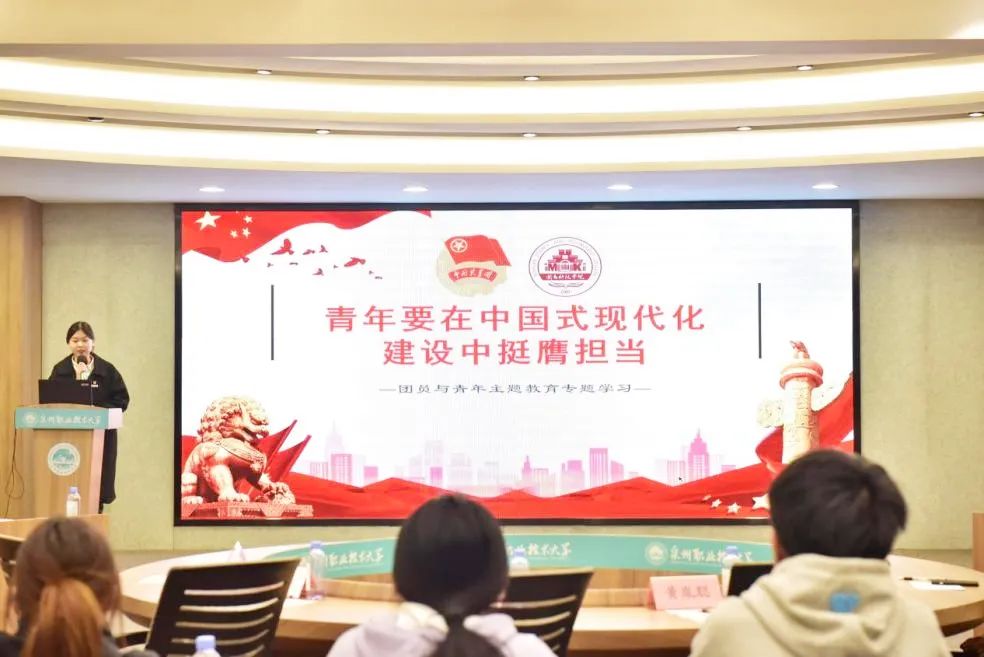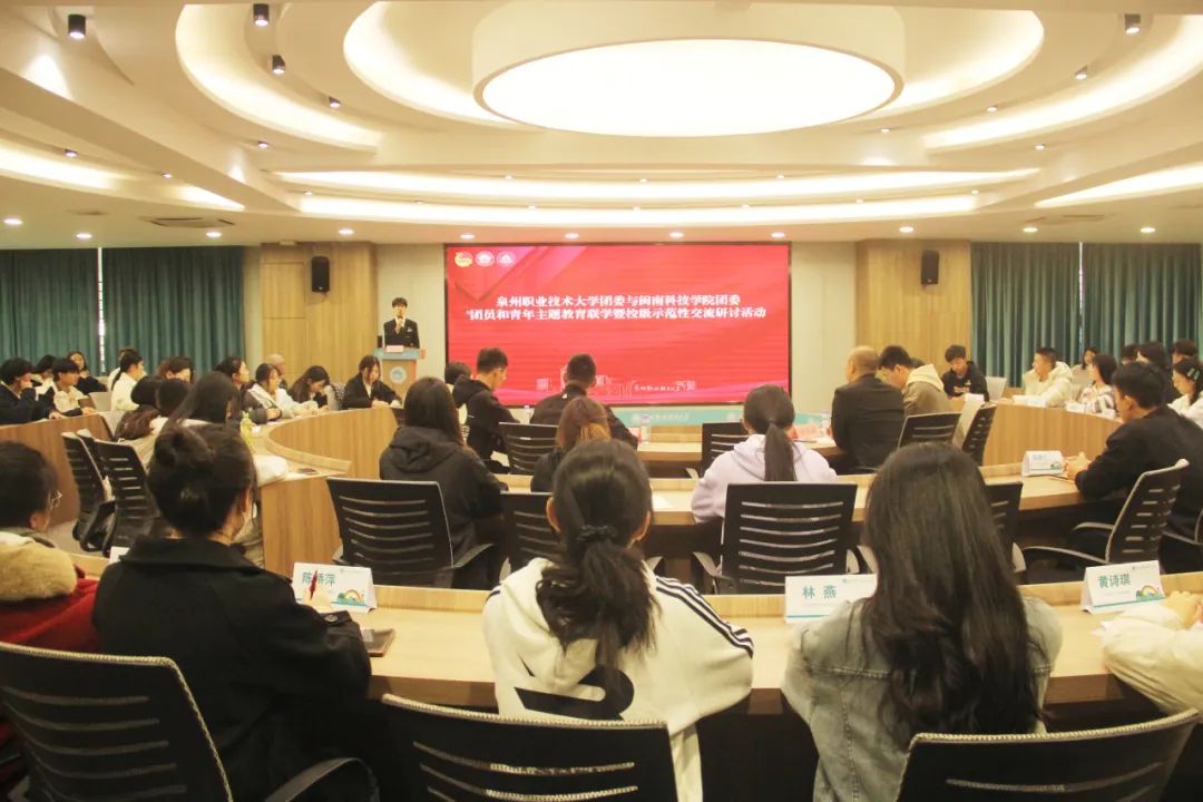 12月27日,MK网页版登录入口团委与泉州职业技术大学团委开展团员和青年主题教育联学活动,深入学习习近平新时代中国特色社会主义思想,聚焦“铸牢对党忠诚、坚定理想信念、发扬斗争精神、勇于挺膺担当”主题,开展辅导报告、主题宣讲和交流研讨,扎实推动团员和青年主题教育走深走实、见行见效。两校团委负责人、团委工作人员,“青马工程”培训班学员代表等近百人参加。